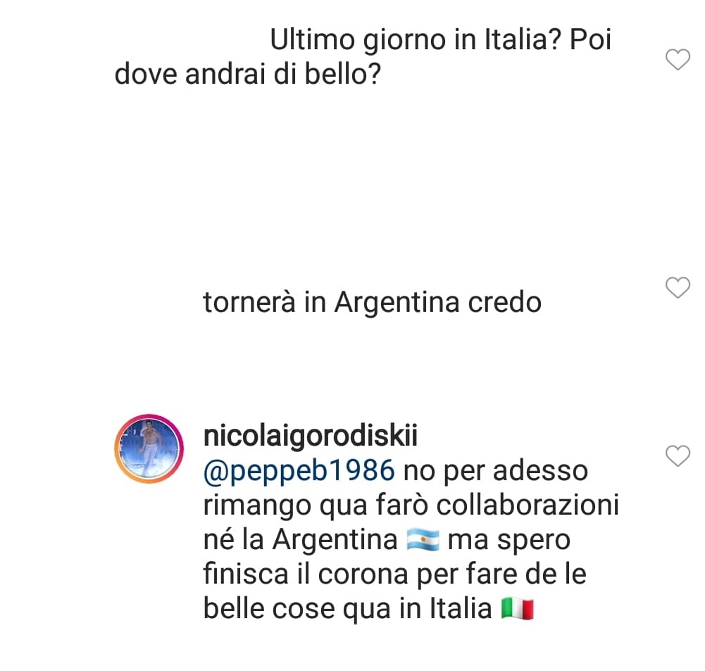 Mentre hanno preso il via i casting di Amici 20, si cercano sempre nuovi concorrenti di Amici All Star. Chi vi parteciperà? Nicolai pare essere fra questi: su Instagram gli è sfuggito un indizio che non è passato inosservato… I suoi follower gli hanno chiesto quali saranno i suoi progetti futuri e lui ha risposto: “No, per adesso rimango qua. Farò collaborazioni. Non in Argentina. Ma spero finisca il periodo del Coronavirus per fare delle cose belle qua in Italia”. Sono stati più espliciti, successivamente, chiedendogli se prenderà parte ad Amici All Star: non ha risposto direttamente, assicurando però loro che non andrà né in Ucraina né in Argentina.