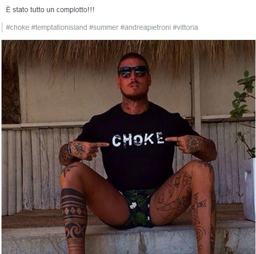 Come ha fatto Vittoria a dimenticare gli atteggiamenti fin troppo spinti che Andrea aveva avuto con Chiara Giorgianni sul quel famoso divanetto, in una delle loro esterne? Com’è stato possibile che siano bastate solo un paio di settimane per dimenticare l’umiliazione pubblica e la figuraccia che la Magagnini professava di aver fatto in trasmissione? E come si sarà giustificato Andrea con la fidanzata e con i genitori di Vittoria dopo essere stato quasi beccato in flagrante? Ebbene, a queste domande, è proprio un amico di Pietroni che, approfittando di una foto che vede il ragazzo ritratto con una t-shirt dalla scritta “Choke“, ha risposto ai tanti quesiti che i fans continuano a porre alla coppia sia su Facebook che su Instagram. “E’ stato tutto un complotto” – si legge sul profilo pubblico di Andrea Pietroni con un hashtag che è un chiaro riferimento a Temptation Island. In che senso, però, possiamo parlare di complotto? Sarebbe stata la redazione a spingere il ragazzo tra le braccia di Chiara Giorgianni e a far vedere a Vittoria solo il peggio del fidanzato, oppure sarebbe stato Pietroni ad essere entrato un pò troppo nella parte e ad aver costruito la storia del finto flirt per l’ex gieffina per attirarsi l’interesse del pubblico?
