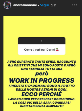 Ha poi raccontato di desiderare una famiglia (con una persona che lo ami davvero) e come immagina la sua carriera futura: “Avrò superato tante sfide, raggiunto gli obiettivi che mi sono posto e avrò una famiglia tutta mia. Però work in progress! I risultati di domani sono il frutto delle nostre azioni di oggi. Ecco perché lavoro duro per crescere ogni giorno. La cosa più bella sarà guardarsi indietro senza rimpianti”.