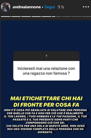 Ha spiegato che con la De Lellis non è stato vero amore, ora ha risposto a una domanda di un follower di Instagram riguardo alla possibilità di innamorarsi di una ragazza sconosciuta ai più: “Mai etichettare chi hai di fronte per cosa fa. Non c’è cosa più sbagliata di valutare una persona per quello che fa e non per ciò che è realmente. Il tuo lavoro, i tuoi hobby e le tue passioni, il tuo passato e il tuo presente compongono ciò che sei. Chi valuta per una di queste aree, non avrà mai una visione completa della persona che ha di fronte”.