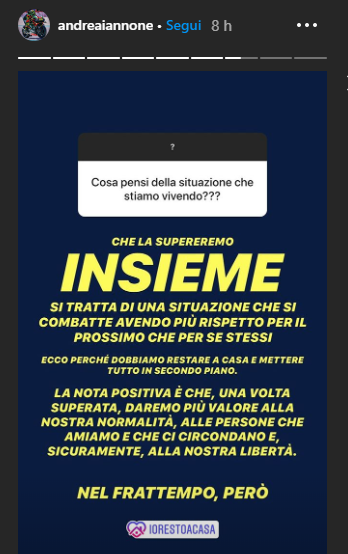 Non solo, ha speso qualche parole sulla quarantena (anche lui la sta passando in casa): “La supereremo insieme! Si tratta di una situazione che si combatte avendo più rispetto per il prossimo che per sé stessi. Ecco perché dobbiamo restare a casa e mettere tutto in secondo piano. La nota positiva è che, una volta superata, daremo più valore alla nostra normalità, alle persone che amiamo e che ci circondano e sicuramente alla nostra libertà. Nel frattempo, però, io resto a casa”.