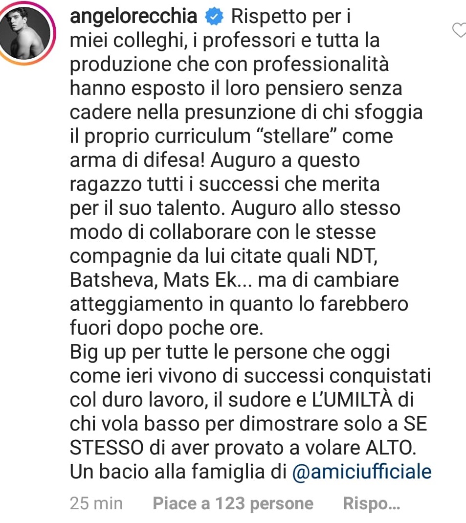 Poi parole dirette a Javier, reo di aver peccato di presunzione facendo una scenata mai vista prima: “Auguro a questo ragazzo tutti i successi che merita per il suo talento. Auguro allo stesso modo di collaborare con le stesse compagnie da lui citate, quali NDT, Batsheva, Mats Ek… ma di cambiare atteggiamento in quanto lo farebbero fuori in poche ore”. Angelo Recchia ha poi voluto fare il suo più sincero in bocca al lupo a chi lavora duramente senza sentirsi un dio sceso in terra: “Big up per tutte le persone che oggi come ieri vivono di successi conquistati col duro lavoro, il sudore e l’umiltà di chi vola basso per dimostrare solo a sé stesso di aver provato a volare altro. Un bacio alla famiglia di Amici”.