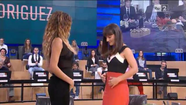 L’INTERVISTA DOPPIA DI BELEN RODRIGUEZ E VIRGINIA RAFFAELE – Tra una battuta e l’altra, sembrano esserci problemi di collegamento, ma dopo pochi secondi è la vera Belen Rodriguez ad apparire in video su Rai2. E’ lei, quella originale, anche lei con un tubino nero attillatissimo che ha mostrato in modo evidente le rotondità della gravidanza. La Raffaele ha i capelli lisci mentre Belen si presenta con il suo nuovo look, ricci e shatush; per Virginia la differenza è dovuta all’umidità! Belen Rodriguez parla della sua gravidanza, delle nausee e delle crisi di pianto causate dagli sbalzi ormonali. Victoria Cabello chiede alla soubrette se veramente avrebbe dovuto prendere il suo posto nella conduzione di Quelli che il calcio, ma l’argentina nega: “Non è vero, non so niente di calcio“. Il giornalista Massimo Caputi testa la preparazione di Belen e di Victoria e a quanto pare la Rodriguez sembra essere più informata sul calcio; daltronde è stata fidanzata per anni con Marco Boriello. Arriva il momento più divertente che mette a confronto i due personaggi: Belen e Virginia in un’intervista doppia in stile Iene. Ripercorriamo le battute più divertenti: Di cosa vai più fiera? Virginia risponde: “Delle mie conquiste professionali, delle meches che illuminano il mio viso, del tatuaggio piccolo e discreto che ho fatto per il mio amore Stefano De Martino e anche di quello che si è visto una volta per sbaglio“. Di cosa ti vergogni? Belen confessa: “Della scaletta di Sarabanda, dove ero inquadrata in un certo modo. Sono cose che si fanno quando si fa la gavetta. Inizi con la fisicità e poi finisci..uguale“. Se dovessi fare un confronto tra l’attuale e l’ex fidanzato? L’imitatrice risponde: “Sono una ragazza romantica, non mi piace parlare di centimetri” e Belen prontamente risponde: “Ah beh, allora sei a posto“. Speri che tuo figlio Santiago finisca sulle copertine come te? Belen spera che il figlio prenda una strada lavorativa diversa, mentre la Raffaele scherza: “Ho già venduto la scarlattina a Vanity Fair e il primo dentino a Donna Moderna“. Qual è il posto più strano dove hai fatto l’amore? “In una grotta” confessa Belen, “Nel tuo camerino Viky” ribatte Virginia.