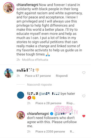 Nel suo post, Chiara ha scritto: “Ora e per sempre sono solidale con la gente di colore nella loro lunga lotta contro il razzismo e la supremazia bianca e per la pace e l’accettazione. So di essere privilegiata e userò sempre questo privilegio per aiutare a combattere le differenze e rendere questo mondo un posto migliore. Proverò a informarmi ancora di più e ad aiutare il più possibile”. Tra i commenti è arrivato un pollice rivolto verso il basso che non è passato inosservato. Anche Chiara lo ha notato, così ha voluto rispondergli. Con queste parole: “Non ho bisogno di followers che non sono d’accordo con ciò che ho detto. Per favore toglimi il follow”.