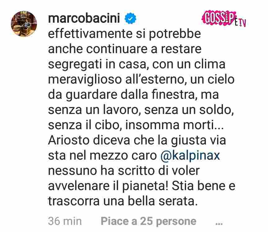 Uno scatto, quello di Marco Bacini e Federica Panicucci, che ha fatto scatenare gli hater: qualcuno gli ha persino detto “Le stai mancando di rispetto” (come potete leggere più in basso nella nostra gallery). L’imprenditore ha risposto così: “Nello specifico, per quale motivo le starei mancando di rispetto? Mi faccia capire le contorsioni del suo cervello che, se tanto mi dà tanto, è l’unica cosa (anzi no, forse non l’unica) che non le si ingrosserà mai!”. E a chi ha fatto sentire il proprio disappunto per la fine della quarantena, ha detto: “Beh, effettivamente si potrebbe anche continuare a restare in casa, con un clima meraviglioso all’esterno, un cielo da guardare dalla finestra, ma senza un lavoro, senza un soldo, senza il cibo, insomma morti… Ariosto diceva che la giusta via sta nel mezzo. Nessuno ha scritto di voler avvelenare il pianeta”.