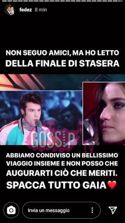 Fedez ha postato tra le sue stories di Instagram un video risalente a X Factor in cui dice a Gaia: “È arrivato il momento di andare là fuori e ritagliarti il tuo posto d’onore nella scena musicale italiana”. E con questo video, con parole scelte non certo a caso, Fedez ha confermato di credere tanto in Gaia. E le ha fatto il suo in bocca al lupo per la finale di Amici: “Non seguo Amici, ma ho letto della finale di stasera. Abbiamo condiviso un bellissimo viaggio insieme e non posso che augurarti ciò che meriti. Spacca tutto Gaia”, con un bel cuore rosso finale. Era la decima edizione di X Factor quando Fedez ha guidato Gaia nel suo primo talent show. E lo ha fatto in maniera impeccabile portandola dritta in finale al Forum di Assago, infatti anche a quei tempi erano in tantissimi a credere che sarebbe stata proprio lei la vincitrice.