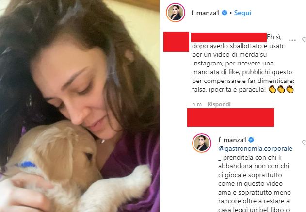 Dopo l’esperienza a Striscia la Notizia e la verità sul litigio con Mara Venier, Francesca Manzini è ritornata al centro dell’attenzione mediatica per via di un botta-e-risposta avvenuto con un follower, che l’ha accusata di maltrattamento di cani. Questo, l’attacco: “E sì, dopo averlo sballottato e usato per un video di m…a su Instagram, per ricevere una manciata di like, pubblichi questo per compensare e far dimenticare: falsa, ipocrita e par…la!”.