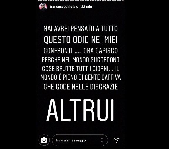 La brutta notizia, coincidente con l’annuncio sui social, Francesco l’ha veramente ricevuta durante le feste. Lenticchio, ancora provato, ha raccontato: “Succede che torno da Temptation Island Vip, faccio ulteriori controlli, ulteriori esami e, pochi giorni prima di Natale mi viene comunicato che quello è un tumore molto pericoloso, che stava schiacciando dei centri nervosi e che doveva essere levato immediatamente, mediante un’asportazione chirurgica. Con un’operazione di microchirurgia al cervello molto invasiva e molto pericolosa”. A chi oggi mette in dubbio la sua storia e quello che ha passato, dunque, Francesco Chiofalo ha replicato dicendo: “Ragazzi cosa volete che vi dica che è stata un’operazione semplice? Non è stata un’operazione semplice. È stata un’operazione difficilissima. Accanto al mio letto c’era un ragazzo della mia stessa età, ha fatto più o meno il mio stesso intervento, solo che lui è rimasto su una sedia a rotelle. Io non vi ho detto nessuna c…..a”. A seguito dei suoi video, in fine, Francesco Chiofalo ha dato voce al suo dispiacere. Di seguito le immagini dello sfogo.