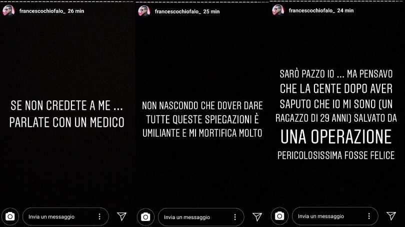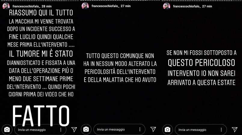 Francesco Chiofalo, nei video pubblicati sul suo profilo, ha dichiarato: “Voglio parlare del video che ho fatto prima di Natale dove vi dicevo che stavo male. Quel video è stato fatto in un momento di poca lucidità, in cui ero molto spaventato e stavo male. Non sono mai stato tanto male in vita mia. In quel video ho spiegato in grandi linee quello che mi succedeva. Non sono stato troppo attento e non sono entrato troppo nel dettaglio di come ho saputo del mio tumore. Io ho saputo del mio tumore tramite un incidente stradale, ma l’incidente lo feci più o meno verso fine luglio”. Dopo l’incidente, ha poi spiegato Francesco, la terribile notizia del tumore al cervello non venne subito confermata. A tal proposito ha spiegato: “Feci questo incidente e come vi raccontai venne lì il medico dicendomi che avevo questa macchia enorme che poteva essere un tumore o una macchia di sangue che si sarebbe riassorbita. Succede che poco dopo parto per Temptation Island Vip, per cui non sono riuscito a fare ulteriori controlli per niente, ma comunque ero tranquillo perché mi era stato detto che probabilmente sarebbe potuta essere una macchia di sangue. Uno in queste circostanze è sempre portato a pensare al meglio”.