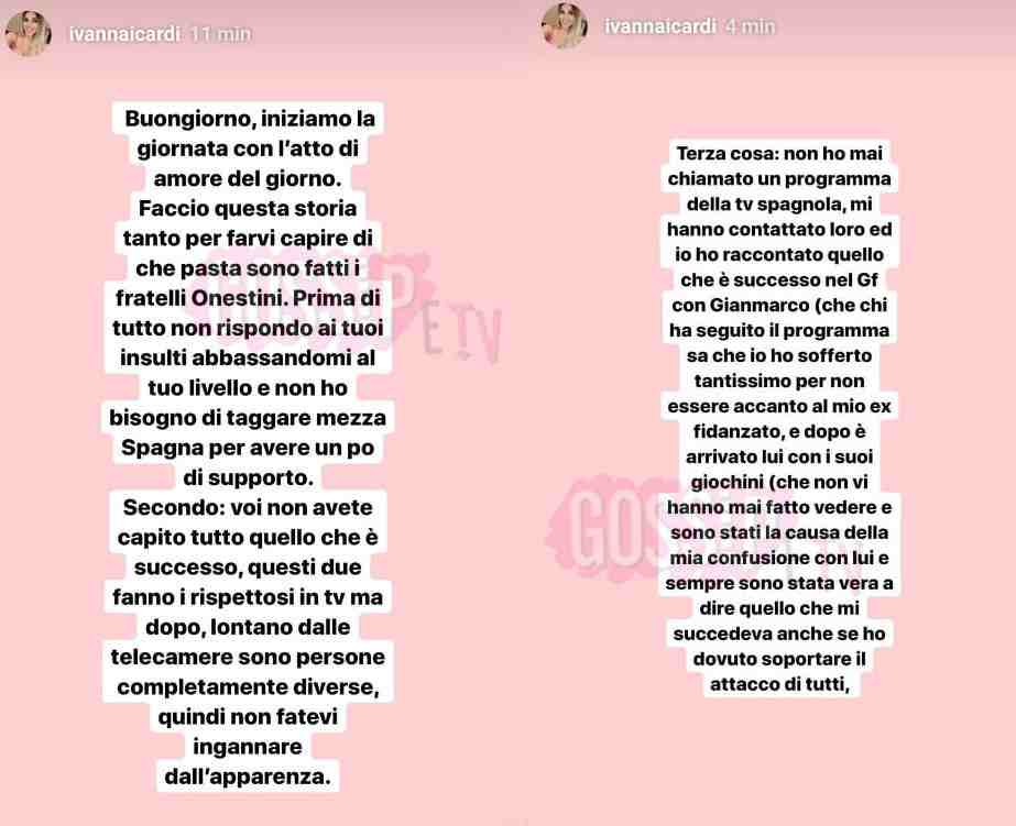 Infatti è subito partita all’attacco: “Voi non avete capito tutto quello che è successo, questi due fanno i rispettosi in tv ma dopo lontano dalle telecamere sono persone completamente diverse, quindi non fatevi ingannare dall’apparenza”. Ivana ha chiarito poi che è stata contattata dalla trasmissione spagnola e non è stata lei a chiedere di intervenire in diretta, per raccontare cosa è successo fra lei e Gianmarco al Grande Fratello. Ha scritto poi di aver sofferto per il comportamento di Gianmarco: “Io ho sofferto tantissimo per non essere accanto al mio ex fidanzato e dopo è arrivato lui con i suoi giochini (che non vi hanno mai fatto vedere e sono stati la causa della mia confusione)”. Ivana ha detto di essere una persona sincera, al contrario degli Onestini che “imparano una sceneggiatura e ti fanno passare per pazza”.