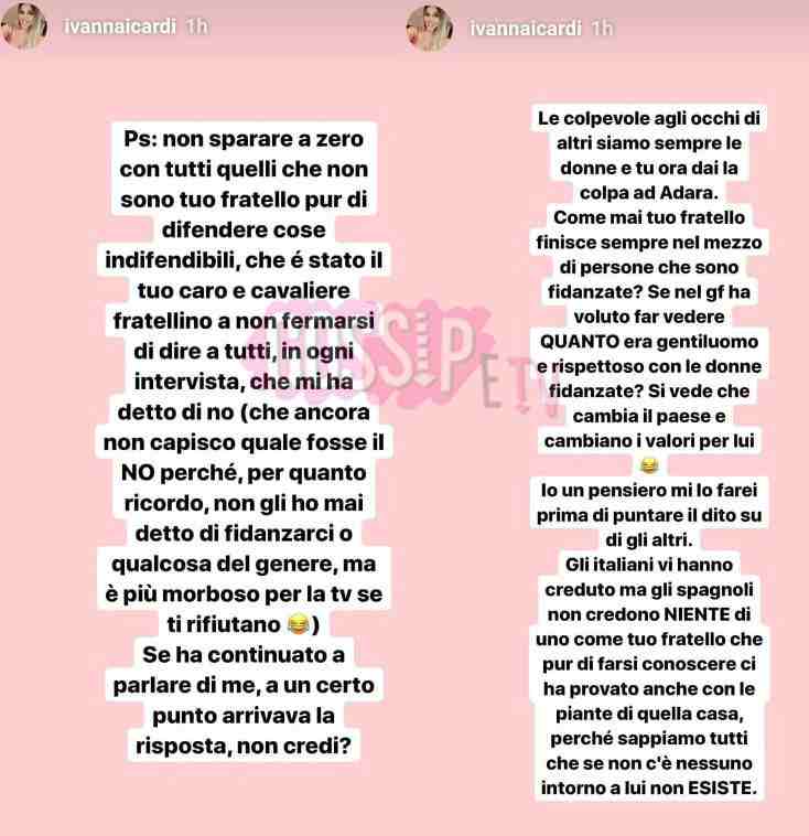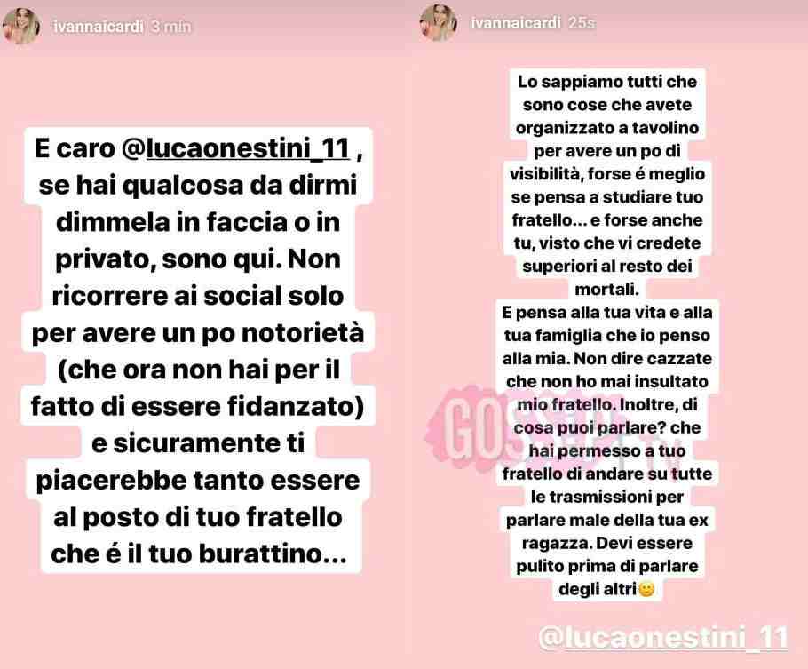La risposta di Ivana Icardi a Luca Onestini non si è fatta attendere, o forse solo un po’. Nella serata di ieri, Luca si è scagliato come una furia contro Ivana accusandola di essere in cerca di notorietà in Spagna e di aver approfittato della presenza di Gianmarco al Gran Hermano per emergere. A dire il vero l’ha accusata anche di aver tentato di sfruttare suo fratello anche in Italia, ma Ivana ha rispedito tutte le accuse al mittente. Ivana stamattina ha pubblicato una serie di stories su Instagram in cui ha scritto ciò che pensa. Ha detto di voler far capire a tutti “di che pasta sono fatti i fratelli Onestini” e che non si sarebbe abbassata al livello di Luca rispondendo con altrettanti insulti. Effettivamente Luca non ci è andato leggero contro Ivana, ma anche lei senza usare insulti ha scritto cose pesanti.