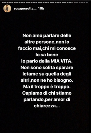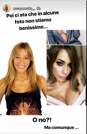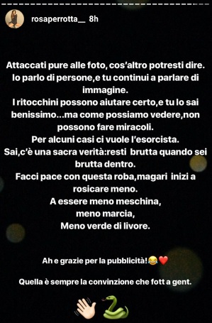 Qualche ora dopo, sempre su Instagram, è arrivata anche la dura replica di Rosa Perrotta a Karina Cascella. L’ex tronista, dopo aver fatto delle pesanti insinuazioni sul passato dell’opinionista, ha scritto: “Non amo parlare delle altre persone, non lo faccio mai, chi mi conosce bene lo sa. Io parlo della mia vita. Non sono solita sparare letame su quella degli altri, ma il troppo è troppo”. A queste parole, poi, è seguita una stories di Rosa dove la stessa metteva a paragone alcune vecchie foto di Karina con altre più recenti. “Attaccati alla foto” ha poi aggiunto la Perrotta “I ritocchi possono aiutare, e tu lo sai benissimo… ma come possiamo vedere non possono fare miracoli. Per alcuni casi ci vuole l’esorcista […] Resti brutta quando sei brutta dentro”.