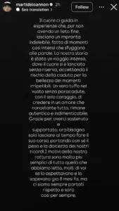 Martina De Ioannon, nel suo annuncio, lo stesso pubblicato poi anche da Ciro, scrive: “Il cuore ci guida in esperienze che, pur non avendo un lieto fine, lasciano un’impronta indelebile, fatta di momenti così intensi che sfuggono alle parole. La nostra storia è stato un viaggio intenso dove il cuore si è lanciato senza riserva… I motivi della rottura sono molto più semplici di tutto quello che abbiamo letto, molti di voi se lo aspettavano e lo sapevano già 8 mesi fa, ma ci siamo sempre portati rispetto e sarà così per sempre“. Il suo – ormai ex – fidanzato aggiunge nella storia successiva: “In un momento così delicato, voglio solo dire grazie a chi ci sta scrivendo. Il vostro affetto è un abbraccio silenzioso ma potente. Vi leggo“.