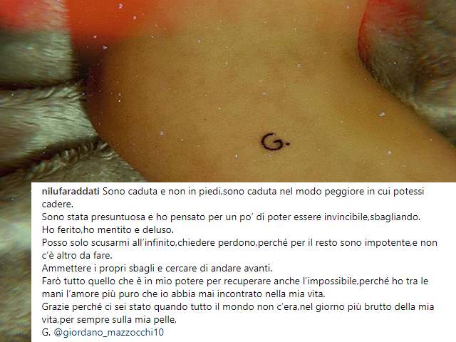 “Sono caduta e non in piedi, sono caduta nel modo peggiore in cui potessi cadere. Sono stata presuntuosa e ho pensato per un po’ di poter essere invincibile, sbagliando. Ho ferito, ho mentito e deluso. Posso solo scusarmi all’infinito, chiedere perdono, perché per il resto sono impotente e non c’è altro da fare. Ammettere i propri sbagli e cercare di andare avanti. Farò tutto quello che è in mio potere per recuperare anche l’impossibile, perché ho tra le mani l’amore più puro che io abbia mai incontrato nella mia vita. Grazie perché ci sei stato quando tutto il mondo non c’era, nel giorno più brutto della mia vita, per sempre sulla mia pelle“, ha scritto Nilufar su Instagram, mostrando il tatuaggio che si è fatta in onore di Giordano.