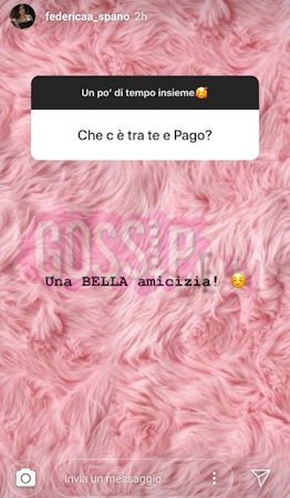 “Cosa c’è tra te e Pago?”, le ha chiesto qualcuno. La risposta di Federica è stata breve e concisa: “Una bella amicizia!”. Ha messo in risalto il “bella” scrivendolo in maiuscolo e poi ha aggiunto un sorriso finale. Insomma, pare che Pago e Federica Spano siano solo amici e non possiamo parlare di nuova coppia. Intanto, Serena Enardu e Alessandro potrebbero uscire allo scoperto a breve…