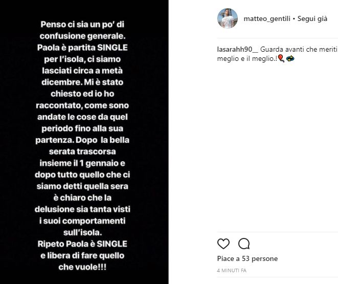AGGIORNAMENTO Matteo Gentili ha chiarito su Instagram la sua posizione: il calciatore ha puntualizzato che Paola Di Benedetto è partita da single ma che le parole prima della partenza avevano lasciato una porta aperta a questo importante amore. In basso la foto con il post di Matteo che chiarisce la situazione!