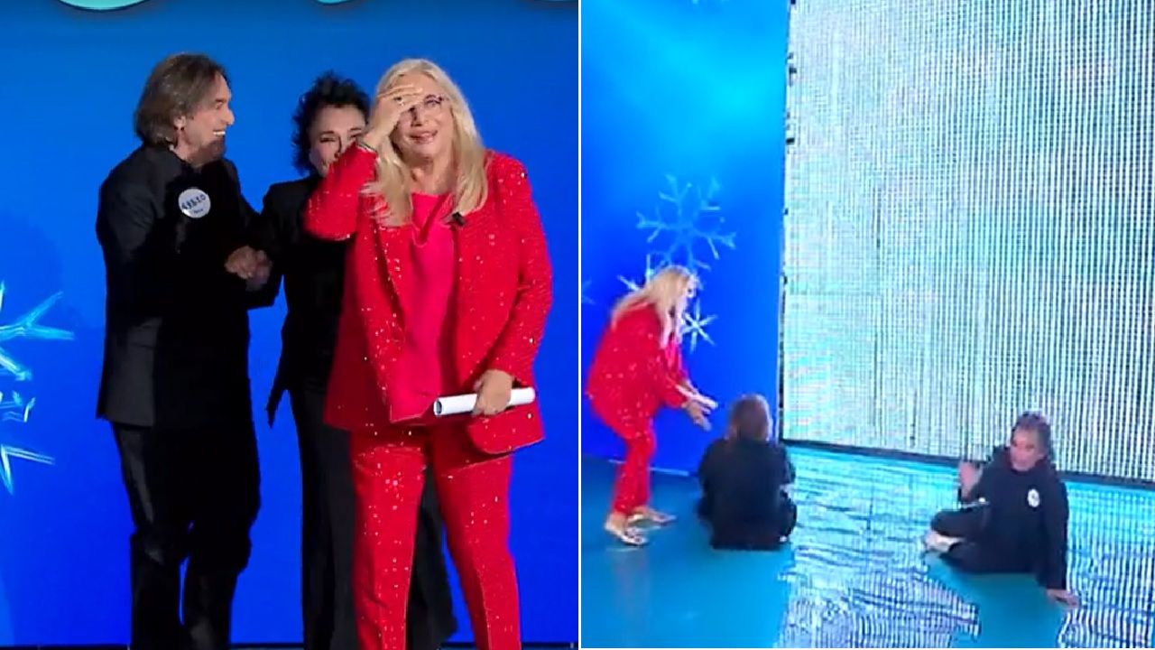 “Ecco I Ricchi e i Poveri”, ha annunciato Venier, che aveva appena concluso l’intervista con Andrea Delogu. Sul fondo dello studio sono così apparsi Sotgiu e Brambati per la classica entrata nel programma. Peccato che non abbiano visto un alto gradino e siano inciampati, cadendo a terra. ‘Zia Mara’ ha immediatamente lasciato la sua postazione e si è precipitata da loro per capire come stessero.