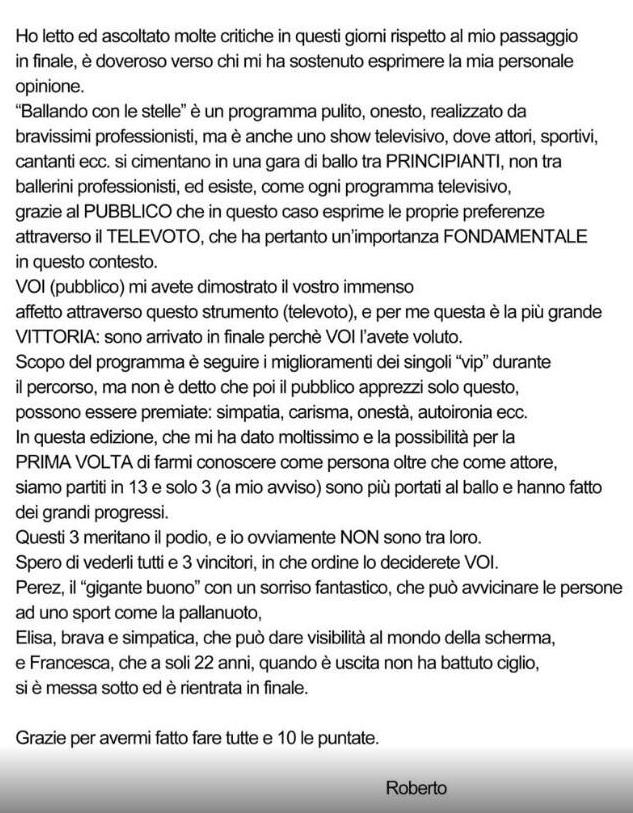 Tra poche ore andrà in onda l’ultimo appuntamento con Ballando con le stelle, talent condotto da Milly Carlucci. Stasera si sfideranno a passi di danza, per aggiudicarsi il primo posto, Elisa Di Francisca con Raimondo Todaro, Lorenzo Flaherty con Natalia Titova, Amaurys Perez con Veera Kinnunen, Francesca Testasecca con Stefano Oradei, Lea T con Simone Di Paquale e Roberto Farnesi con Samanta Togni. Proprio su Roberto Farnesi ci sono state alcune polemiche, in quanto l’attore non è stato considerato molto sciolto nel ballare. Malgrado ciò, Farnesi è in finale ed è sempre stato apprezzato dal pubblico. Tramite il suo profilo Twitter, il concorrente di Ballando con le stelle ha voluto mettere in chiaro questa faccenda. Farnesi ha parlato della trasmissione, definendola uno spettacolo “pulito, onesto e realizzato da bravissimi professionisti” e ha aggiunto che il pubblico ha un’importanza fondamentale perché esprime le proprie preferenze tramite il televoto. “Sono arrivato in finale perché VOI l’avete voluto”, ha sentenziato cercando di porre fine a tutte le polemiche. E come dargli torto?