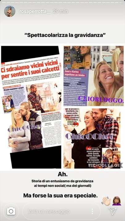 Dopo la puntata, Rosa è tornata sull’argomento e si è sfogata su Instagram: “Io non trovo niente di volgare nell’esporre il proprio pancione e mi preoccupa seriamente chi parla di malizia. Evviva le donne che vivono serenamente col proprio corpo anche in gravidanza. Evviva l’orgoglio di mostrare il pancione, non c’è niente di più sacro e pulito”. E poi ancora: “È incredibile come diventino suscettibili e sensibili certe donne quando si parla delle altre, le stesse che come dicevo oggi mostrano con orgoglio, tutto l’anno, […] senza il minimo problema”. Ma è negli hashtag che Rosa lascia intendere il suo pensiero su quanto le è stato detto a Pomeriggio 5: “#unpodicoerenza #machivicrede #tuttemoralisteallimprovviso #parlasemprechinonpuó #lepredichedaipulpitipiusporchi”. Il riferimento era ovviamente a Karina, di cui ha poi realizzato un collage di foto risalenti alla sua gravidanza e lo ha postato tra le storie. Immediata la risposta di Karina.