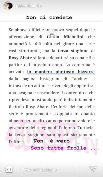 Tra gli hashtag infatti c’era anche questo: “#NONÈROSY3”. Molti hanno pensato che fosse un tentativo di deviare i fan, anche perché l’autore nel video dice che ci sono novità in arrivo ma che è presto per rivelarle. La felicità dei fan è stata spezzata improvvisamente dall’intervento di Giulia Michelini, che su Instagram ha scritto: “Non ci credete. Non è vero. Sono tutte frolle…”. Dunque la Michelini ha smentito la terza stagione, a meno che anche lei non stia giocando un po’ del confondere i fan come con l’hashtag. Ciò che è certo è che sulla lavagna c’è davvero il nome di Rosy Abate, così come nella prima colonna si legge in alto “Rosy vive isolata”. E chissà con un buon fermo immagine si riuscirebbe a leggere tanto altro, per capirci meglio.