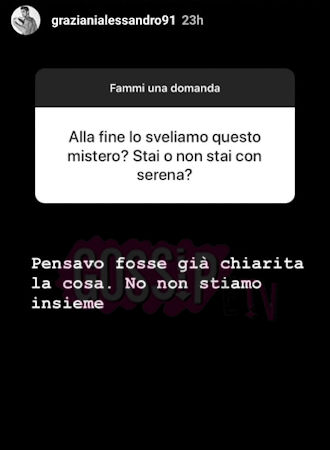 Ma adesso che sono passati due mesi dalla fine delle riprese, ci sono news su Serena e Alessandro dopo Temptation? La risposta è sì e sono arrivate direttamente dai loro profili Instagram. Ieri Alessandro ha risposto alle domande dei fan e alcune erano sulla sua avventura nel reality show. Sull’esperienza a Temptation Island Vip come tentatore, il pallavolista ha detto: “Bellissima, tornassi indietro lo rifarei mille volte”. Poi qualcuno gli ha chiesto se è preso da qualcuno in questo periodo e lui ha risposto in maniera negativa. A questo punto c’è stato chi ha chiesto direttamente di svelare il mistero e dire se sta insieme a Serena oppure no. Lui ha risposto, stavolta senza girarci troppo intorno: “Pensavo fosse già chiarita la cosa. No, non stiamo insieme”.