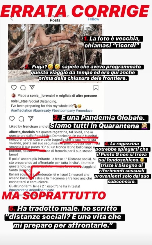 Prima di tutto, Soleil ha risposto ad Alberto Dandolo: “Errata corrige! 1. La foto è vecchia, chiamasi ‘ricordi’; 2. Fuga? Sapete che avevo programmato questo viaggio da tempo ed ero qui anche prima della chiusura delle frontiere; 3. È una pandemia globale. Siamo tutti in quarantena; 4. La ragazzina potrebbe spiegarti che il punto G non si trova sul fondoschiena. Triste il bisogno di riferimenti sessuali provenienti solo dal subconscio; 5. Ma soprattutto… Ha tradotto male. Ho scritto: ‘Distanze sociali? È una vita che mi preparo per affrontarle'”.