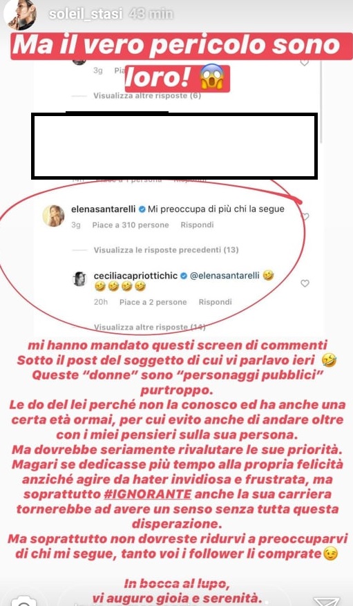Sapeva che, dopo Pechino Express, avrebbe ricevuto un sacco di critiche, ma non si sarebbe mai aspettata di assistere a tutto questo! Elena Santarelli ha sostenuto le parole di Dandolo scrivendo questo messaggio: “Mi preoccupa di più chi la segue”. Soleil non è rimasta ovviamente in silenzio: “Mi hanno mandato questi screen di commenti sotto il post del soggetto di cui vi parlavo ieri. Queste ‘donne’ sono ‘personaggi pubblici’, purtroppo. Le do del lei perché non la conosco e ha anche una certa età, ormai, perciò evito di andare oltre coi miei pensieri sulla sua persona”.
