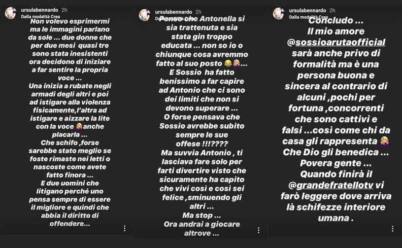 Ursula ha scritto il suo pensiero su quanto accaduto, anche se inizialmente aveva deciso di non farlo. “Le immagini parlano da sole”, così ha esordito nelle sue stories su Instagram. Prima ha parlato della lite tra Fernanda e Antonella, ma riferendosi forse anche a Licia. Ha parlato di due concorrenti che “sono state inesistenti e ora decidono di iniziare a far sentire la propria voce”. Ha parlato di Fernanda dicendo che ha rubato negli armadi, un’altra che ha istigato alla violenza e aizzato la lite con la voce. Forse Licia? Probabilmente sì, visto che dopo ha difeso Antonella: “Penso si sia trattenuta e sia stata fin troppo educata, non so io o chiunque cosa avremmo fatto al suo posto”.