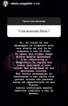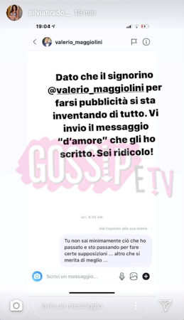 Anche oggi ne ha parlato in modo non proprio positivo, infatti: “Ho speso già troppo tempo dietro questa questione. L’ho conosciuta a Temptation, ho capito che stava recitando e sono uscito dal programma di mia spontanea volontà. Non volevo proseguire la conoscenza e mai nella vita potrei volere una persona falsa ed opportunista al mio fianco. Lascio continuare questo teatrino ridicolo a chi di dovere”. Immediata la replica di Silvia Tirado, che ha postato il messaggio che ha inviato a Valerio. E ha scritto: “Dato che il signorino Valerio per farsi pubblicità si sta inventando di tutto. Vi invio il messaggio ‘d’amore’ che gli ho scritto. Sei ridicolo”. Va detto comunque che il single non ha parlato di messaggio d’amore, si è limitato a dire che Silvia ha risposto alla sua storia e così è stato, in effetti. Per i più curiosi, questo è il messaggio in questione: “Tu non sai minimamente ciò che ho passato e sto passando per fare certe supposizioni… Altro che si merita di meglio”.