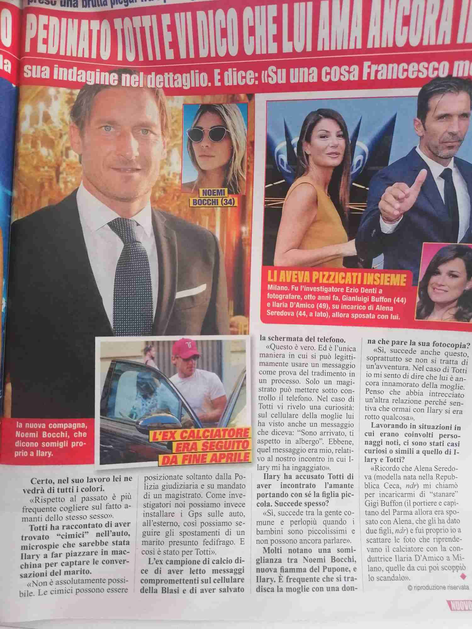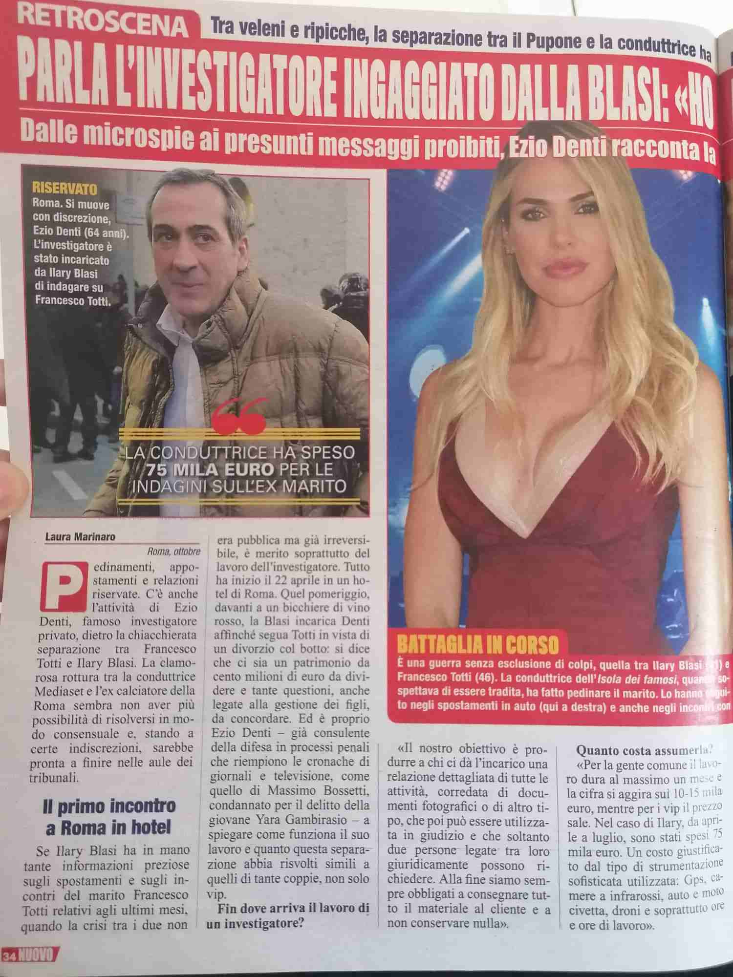 Totti, Ilary e l’investigatore privato: il mistero s’infittisce. Francesco ha confermato la presenza di una persona pagata dall’ex moglie per pedinarlo. Qualche tempo dopo è apparso sul settimanale Nuovo un’intervista a Ezio Denti, professionista del settore, che ha addirittura spifferato la presunta cifra ricevuta dalla Blasi (si parla di 75mila euro).