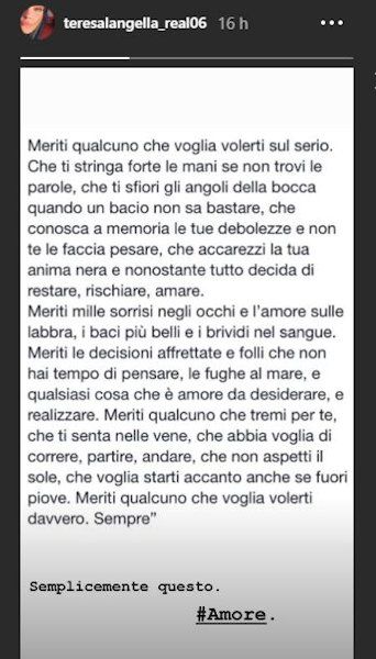 “Meriti qualcuno che voglia volerti sul serio. Che ti stringa forte le mani se non trovi le parole […] Meriti mille sorrisi negli occhi e l’amore sulle labbra, i baci più belli e i brividi nel sangue. […] Meriti qualcuno che tremi per te, che ti senta nelle vene, […] che voglia starti accanto anche se fuori piove […]. Meriti qualcuno che voglia volerti davvero. Sempre”. Queste e tante altre sono le frasi che si leggono nella storia di Teresa Langella su Instagram. E il tutto richiama un po’ ciò che lei ha detto ad Antonio non scegliendolo. Ma potrebbero essere proprio queste le frasi fatte a cui Antonio Moriconi non riesce a trovare una risposta? Magari sì.