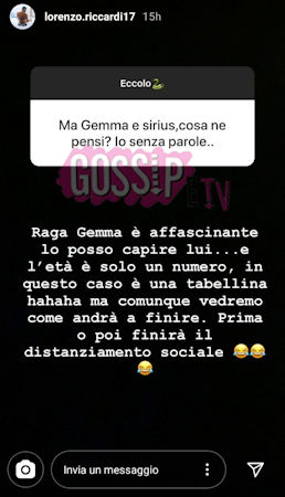 Stiamo parlando di Lorenzo Riccardi, anche lui opinionista di Uomini e Donne ma del Trono Classico, che però è ancora in vacanza. Su Instagram qualcuno gli ha chiesto un parere su Gemma e Sirius e Lorenzo ha risposto senza nascondersi. La sua risposta però nasconde anche una frecciatina, ma vediamo cosa ha scritto. La prima parte del suo commento è positiva: “Gemma è affascinante lo posso capire lui… E l’età è solo un numero, in questo caso è una tabellina”. Ha aggiunto una risata per far intendere che fosse una battuta, e ormai conosciamo bene l’ironia di Lorenzo, ed è solito infilare battutine nei suoi discorsi.