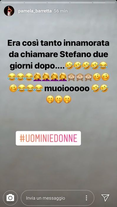 Già qualche giorno fa Pamela Barretta parlò di un messaggio di Roberta inviato a Stefano. Con questa rivelazione, ha fatto esplodere una bomba. Oggi tra le storie sul suo profilo Instagram, dopo la puntata di Uomini e Donne è comparsa questo messaggio: “Era così innamorata da chiamare Stefano due giorni dopo”. E dopo queste parole ha inserito tantissime risate, emoji con le mani fra i capelli e emoji di scimmiette che si tappano la bocca. Dunque, ricapitolando, dopo aver registrato la puntata di Uomini e Donne Over, Roberta avrebbe cercato Stefano! Non sappiamo quale delle due puntate, se quella con lo schiaffo oppure quella in cui ha ammesso di essersi innamorata di Riccardo. Quest’ultimo, comunque, ha voluto difendere la Dama dal pubblico social. Il motivo per cui Roberta potrebbe aver cercato Stefano è facilmente immaginabile. Lui, infatti, tempo fa disse di avere un debole per Roberta e che avrebbe voluto conoscerla. Ha rischiato di perdere Pamela proprio per questo motivo.